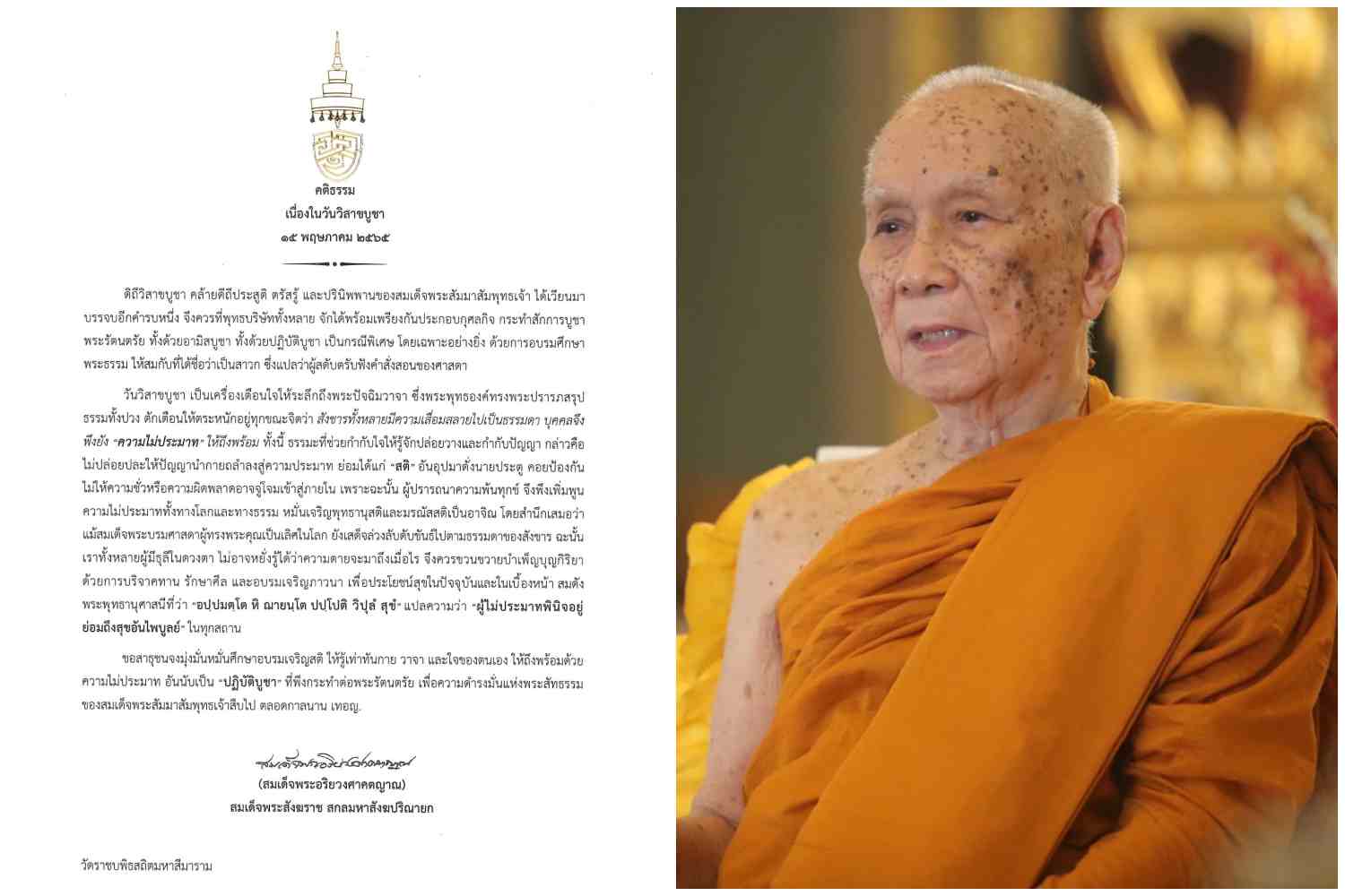 "สมเด็จพระสังฆราช" ประทานพระคติธรรมเนื่องในวันวิสาขบูชา ทรงแนะชาวพุทธหมั่นอบรมเจริญสติให้รู้เท่าทันกาย วาจา ใจของตนเอง และถึงพร้อมด้วยความไม่ประมาท