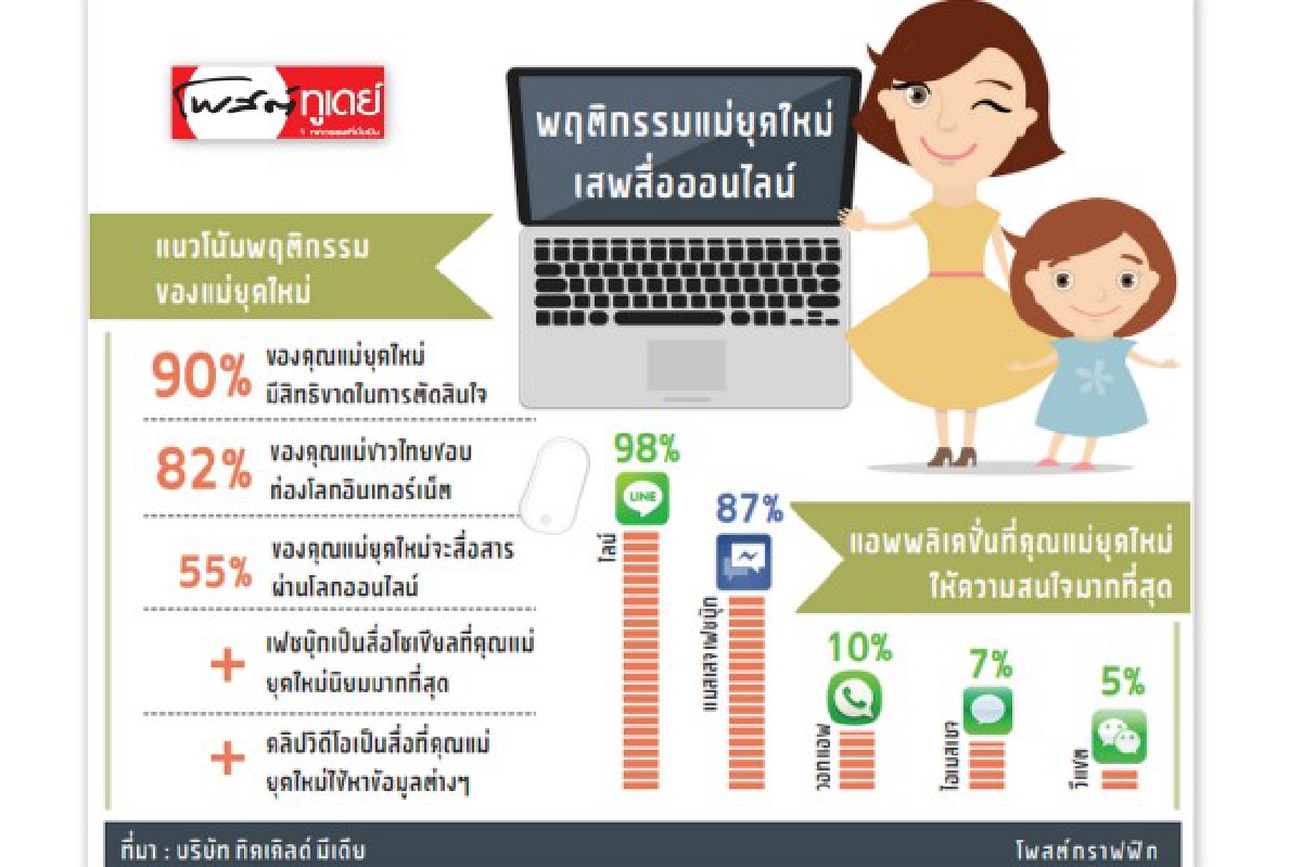 นอกจากจะหาข้อมูลผ่านเว็บไซต์แล้ว 55% คุณแม่ชาวไทยยังมีการติดต่อสื่อสารกับคุณแม่อื่นๆ ผ่านโลกออนไลน์อย่างน้อยสัปดาห์ละ 1 ครั้ง โดยสื่อโซเชียล 5 อันดับแรกที่ได้รับความนิยมมากที่สุดในกลุ่มคุณแม่ยุคใหม่ของไทย คือ ไลน์ 98% ตามด้วย เมสเซจเฟซบุ๊ก 87% วอตส์แอพ 10% ไอแมสเสจ 7% และวีแชท 5%