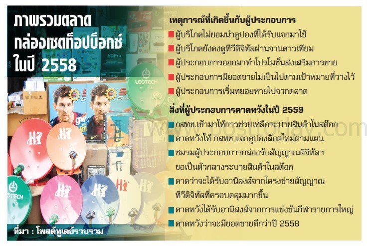 แต่หากมองย้อนกลับไปที่ปี 2558 ผู้ประกอบการกล่องเซตท็อป บ็อกซ์ค่อนข้างประสบกับปัญหาทางด้านยอดขายพอสมควร เนื่องจากคูปองที่ภาครัฐแจกออกไป ผู้บริโภคไม่ยอมนำคูปองออกมาแลกกล่องเซตท็อปบ็อกซ์ เนื่องจากมีปัญหาเรื่องการส่งสัญญาณ เพราะโครงข่ายยังติดตั้งไม่เรียบร้อย จึงทำให้การส่งสัญญาณออกอากาศในระบบดิจิทัลไม่ทั่วถึง ซึ่งปัญหาที่เกิดขึ้นทำให้ผู้บริโภคส่วนใหญ่ยังคงรับชมรายการของช่องทีวีดิจิทัลผ่านจานดาวเทียมเป็นหลัก