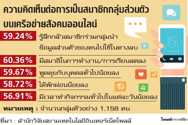 ทั้งนี้ ประเด็นดังกล่าวที่ว่าคนที่เป็นสมาชิกกลุ่มส่วนตัวฯ มากถึง 59.24% รู้สึกกลัวว่าจะมีสมาชิกร่วมกลุ่มส่วนตัวบนเครือข่ายสังคมออนไลน์จะนำข้อมูลส่วนตัวของตนไปใช้ในทางที่ไม่เหมาะสม เช่น แอบอ้างทำธุรกรรมต่างๆ ขายสินค้า การหลอกลวง เป็นต้น ส่วนประเด็นความกังวลอื่น เช่น คนที่เป็นสมาชิกกลุ่มส่วนตัวฯ มีความคิดเห็นว่าการเป็นสมาชิกกลุ่มส่วนตัวหลายกลุ่มบนเครือข่ายสังคมออนไลน์จะส่งผลให้มีสมาธิทำงานหรือเรียนลดลง ได้พูดคุยกับบุคคลทั่วไปน้อยลง พักผ่อนน้อยลง มีเวลาทำกิจกรรมทั่วไป เช่น อ่านหนังสือ ดูโทรทัศน์ รับประทานอาหาร ลดลง