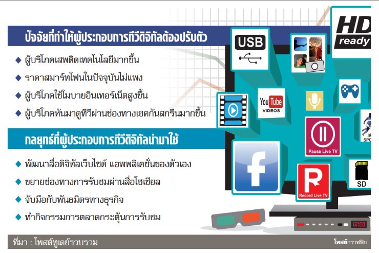 แนวโน้มที่เกิดขึ้นส่งผลให้ผู้ประกอบการทีวีดิจิทัลต้องใช้งบลงทุนส่วนหนึ่งไปกับการพัฒนาเว็บไซต์ หรือแอพพลิเคชั่น เพื่ออำนวยความสะดวกให้กับผู้บริโภคที่ต้องการรับชมรายการทีวีผ่านหน้าจอมือถือ แท็บเล็ต หรือหน้าจอคอมพิวเตอร์ ซึ่งกลยุทธ์ดังกล่าวนอกจากจะมีประสิทธิภาพในด้านของการขยายฐานผู้ชมได้แล้ว ในอนาคตยังถือเป็นอีกหนึ่งช่องทางในการหารายได้เสริมหน้าจอทีวี
