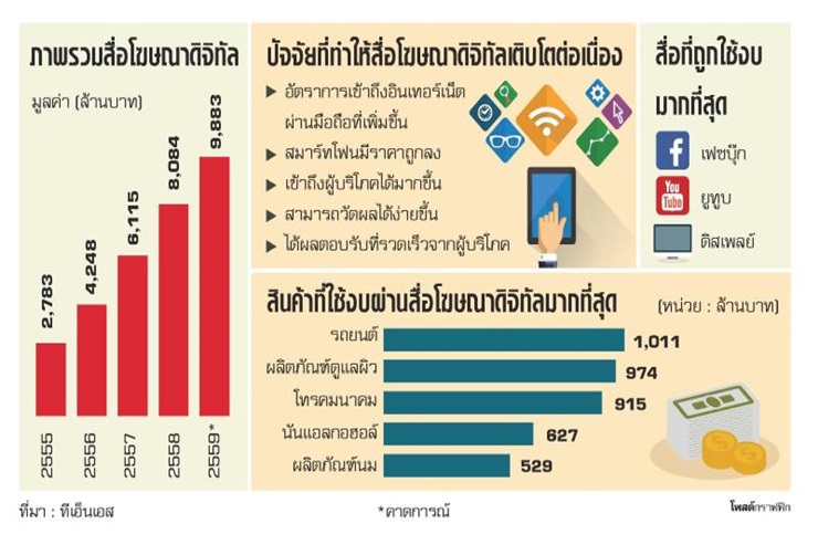 สำหรับภาพรวมของสื่อโฆษณาดิจิทัลในสิ้นปี 2559 นี้ คาดว่าจะมีมูลค่าอยู่ที่ประมาณ 9,883 ล้านบาท หรือเติบโต 22% จากปี 2558 ที่มีมูลค่าอยู่ที่ 8,084 ล้านบาท โดยในส่วนของสื่อโซเชียลมีเดียที่ได้รับความสนใจจากเจ้าของสินค้าหันมาใช้งบโฆษณามากที่สุด คือ เฟซบุ๊ก มีการใช้งบอยู่ที่ประมาณ 2,842 ล้านบาท เพิ่มขึ้นจากปี 2558 ที่มีการใช้งบอยู่ที่ 1,907 ล้านบาท ตามด้วยยูทูบ มีการใช้งบอยู่ที่ 1,663 ล้านบาท เพิ่มขึ้นจากปี 2558 ที่มีการใช้งบไป 1,599 ล้านบาท และสื่อดิสเพลย์ มีการใช้งบที่ 1,620 ล้านบาท เพิ่มขึ้นจากปี 2558 ที่มีการใช้งบไป 1,659 ล้านบาท