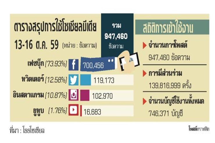 บริษัท โธธ โซเชียล ผู้ให้บริการระบบข้อมูลเชิงลึกและวิเคราะห์ผลด้านโซเชียลมีเดีย ได้ให้ข้อมูลเกี่ยวกับการใช้สื่อสังคมออนไลน์ในช่วงวันที่ 13-16 ต.ค.ที่ผ่านมา พบว่าประชาชนชาวเน็ตมีการใช้คีย์เวิร์ดเพื่อโพสต์ข้อความในสื่อสังคมออนไลน์ โดยใช้คำว่า ทรงพระเจริญ มากที่สุดถึง 3.44 แสนข้อความ คิดเป็น 29.05% รองลงมาคือคำว่า ทุกชาติไป 2.78 แสนข้อความ คิดเป็น 23.49% และคำว่า ในหลวง 1.51 แสนข้อความ คิดเป็น 12.80%