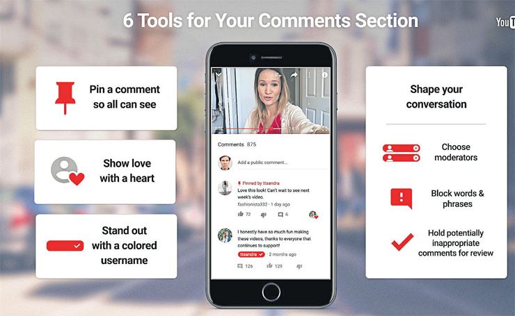 นอกจากนี้ ยังสามารถแสดงความรู้สึกด้วยรูปหัวใจของครีเอเตอร์ การแสดงความรักด้วยรูปหัวใจไปยังความคิดเห็นที่คุณชื่นชอบ เป็นวิธีการใหม่และแสนสะดวก ที่แสดงว่าคุณรับรู้ความคิดเห็นต่างๆ จากชุมชนบนช่องยูทูบของคุณ รวมถึงการไฮไลต์ชื่อของครีเอเตอร์ การเปิดตัวฟีเจอร์แสดงความคิดเห็นที่ช่วยให้คุณมอบหมายผู้ดูแลที่คุณไว้วางใจเข้ามาจัดการลบความคิดเห็นออกจากวิดีโอของคุณได้ ไปจนถึงการสามารถขึ้นบัญชีดำให้คำและวลีที่ไม่เหมาะสมได้อีกด้วย