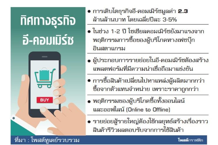 ปีนี้ธุรกิจอี-คอมเมิร์ซยังฝุ่นตลบหลังการรุกซื้อกิจการของค่ายใหญ่ๆ และอยู่ในช่วงการจัดทัพปรับโครงสร้างกันอยู่ แต่สมรภูมิอี-คอมเมิร์ซปีหน้า เชื่อว่า การแข่งขันจะดุเดือดแน่นอน เมื่อปัจจัยทุกอย่างพร้อมหมดแล้วไม่ว่าจะเป็นผู้ซื้อ ช่องทางจำหน่ายที่มีมากมาย ทั้งโซเชียลมีเดีย เว็บไซต์ แอพพลิเคชั่น รวมทั้งระบบการชำระเงินฟินเทค เอื้อให้คนจ่ายง่าย สะดวก ช็อปปิ้งกันอย่างเพลิดเพลินทุกที่ทุกเวลา
