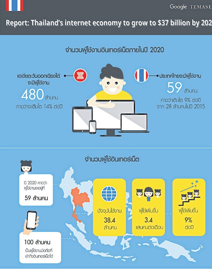 กูเกิล และเทมาเสก เปิดเผยผลวิจัยล่าสุดที่แสดงให้เห็นศักยภาพและโอกาสต่างๆ ในตลาดเอเชียตะวันออกเฉียงใต้ทั้ง 6 ประเทศ ในชื่อว่า “e-conomy SEA : Unlocking the $200 billion opportunity in Southeast Asia” โดยพบว่าประเทศไทยมีการเติบโตของอินเทอร์เน็ตอย่างรวดเร็ว หรือเติบโตประมาณ 9% ต่อปี และจะมีมูลค่าแตะ 59 ล้านเหรียญสหรัฐ (หรือราว 2,000 ล้านบาท ในปี 2563 เพิ่มจาก 29 ล้านเหรียญสหรัฐ (หรือราว 1,000 ล้านบาท) ในปี 2558