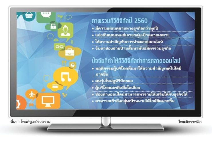 การแข่งขันของธุรกิจทีวีดิจิทัลในปี 2560 ยังคงเป็นปีที่มีการแข่งขันกันอย่างรุนแรง เพราะนอกจากจะแข่งกันที่หน้าจอโทรทัศน์หรือว่าออฟไลน์แล้ว ในปี 2560 นี้การแข่งขันในช่องทางออนไลน์กับผ่าน โซเชียลมีเดียน่าจะรุนแรงมากขึ้น เนื่องจากปัจจุบันพฤติกรรมของผู้บริโภคมีการเปลี่ยนแปลงไปจากเดิมค่อนข้างมาก โดยเฉพาะกลุ่มคนรุ่นใหม่ที่ปัจจุบันดูเหมือนว่าทีวีจะกลายเป็นเหมือนเฟอร์นิเจอร์ชิ้นหนึ่งภายในบ้านไปแล้ว เนื่องจากความสนใจของกลุ่มคนรุ่นใหม่จะอยู่ที่หน้าจอคอมพิวเตอร์ แท็บเล็ต และมือถือ ซึ่งสัดส่วนเริ่มแซงหน้าจอทีวี