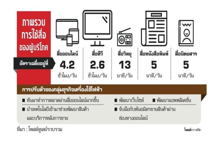 จากพฤติกรรมของผู้บริโภคที่ให้ความสำคัญกับสื่อออนไลน์มากขึ้น ส่งผลให้ปัจจุบันสื่อออนไลน์กลายเป็นสื่อที่ผู้บริโภคใช้งานนานที่สุดมีอัตราเฉลี่ย อยู่ที่ 4.2 ชั่วโมง/วัน ขณะที่สื่อทีวีมีอัตราเฉลี่ยอยู่ที่ 2.6 ชั่วโมง/วัน สื่อวิทยุมีอัตราเฉลี่ยอยู่ที่ 13 นาที/วัน สื่อหนังสือพิมพ์และนิตยสารมีอัตราเฉลี่ยอยู่ที่ 5 นาที/วัน