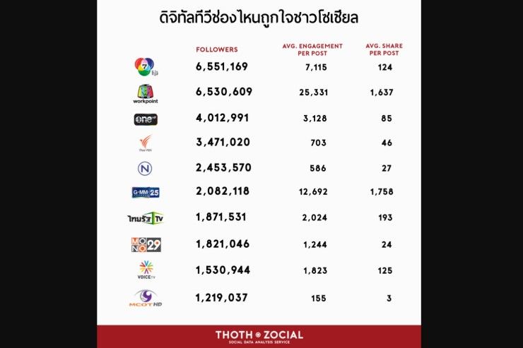 จากข้อมูลจะเห็นได้ว่าแม้จะเป็นโลกออนไลน์ ช่อง 7 ก็ยังคงเป็นช่องที่มีฐานแฟนมากที่สุด และตามติดมาด้วยเวิร์คพอยท์ ส่วนช่องที่ได้รับค่าปฏิสัมพันธ์เฉลี่ยต่อโพสต์มากที่สุดกลับเป็นของเวิร์คพอยท์ จากรายการทีวีที่ค่อนข้างถูกใจและกลยุทธ์การสื่อสารบนโซเชียลมีเดียอย่างได้ผลโดยห่างจากที่ 2 อย่าง GMM25 ถึงเท่าตัว