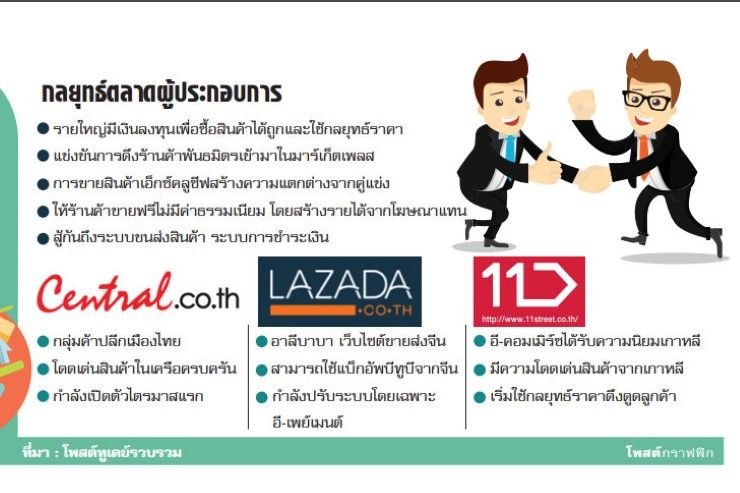 เมื่อรายใหญ่พร้อมเปิดเกมรุกตลาดอี-คอมเมิร์ซ มาร์เก็ตเพลสในไทย ทั้งลาซาด้าภายใต้เงาของอาลีบาบา อีเลฟเว่น สตรีท จากเกาหลี หรือกระทั่งกลุ่มเซ็นทรัลกำลังซุ่มเปิดตัวมาร์เก็ตเพลส ส่งผลให้ตลาดอี-คอมเมิร์ซฝุ่นตลบ รายเล็กต้องปรับตัว เป็นยุคของการต่อสู้รายใดเงินหนาถึงมีความได้เปรียบ