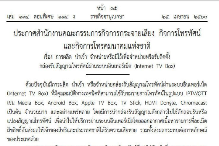 เมื่อวันที่ 25 เม.ย. ที่ผ่านมา ราชกิจจานุเบกษาได้เผยแพร่ ประกาศสํานักงานคณะกรรมการกิจการกระจายเสียง กิจการโทรทัศน์ และกิจการโทรคมนาคมแห่งชาติ (กสทช.) เรื่อง การผลิต นําเข้า จําหน่ายหรือมีไว้เพื่อจําหน่ายหรือรับติดตั้ง กล่องรับสัญญาณโทรทัศน์ผ่านระบบอินเทอร์เน็ต (Internet TV Box) โดยมีสาระสำคัญคือ ผู้ใดประสงค์จะผลิต นําเข้า จําหน่ายหรือมีไว้จําหน่ายหรือรับติดตั้งกล่องรับสัญญาณโทรทัศน์ผ่านระบบอินเทอร์เน็ต จะต้องขอรับอนุญาตจากกสทช. หารฝ่าฝืนจะต้องระวางโทษจําคุกไม่เกินสองปีหรือปรับไม่เกินสองล้านบาทหรือทั้งจําทั้งปรับ
