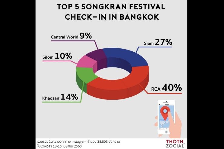 เราได้เก็บรวบรวมข้อมูลจากทาง Instagram เพื่อดูว่าคนส่วนมากเช็กอินสถานที่เล่นน้ำที่ไหนในกรุงเทพฯ กันบ้างในช่วงวันที่ 13-15 เม.ย.ที่ผ่านมา โดยพบว่า RCA เป็นสถานที่มีคนเช็กอินสูงที่สุด 40% เพราะมาพร้อมกับกิจกรรม ONYX Presents Aquafest 2017 และยังมีเทศกาลดนตรี S2O ภายใต้ ชื่องาน S2O Songkran Music Festival 2017 รองมาคือ สยาม ที่ปีนี้มาในธีมสงกรานต์เมษาผ้าขาวม้ายกสยามเป็นสถานที่มีคนเช็กอินรองลงมา 27% ตามด้วย ข้าวสาร สีลม และเซ็นทรัลเวิลด์ มีจำนวนเช็กอิน 14% 10% และ 9% ตามลำดับ