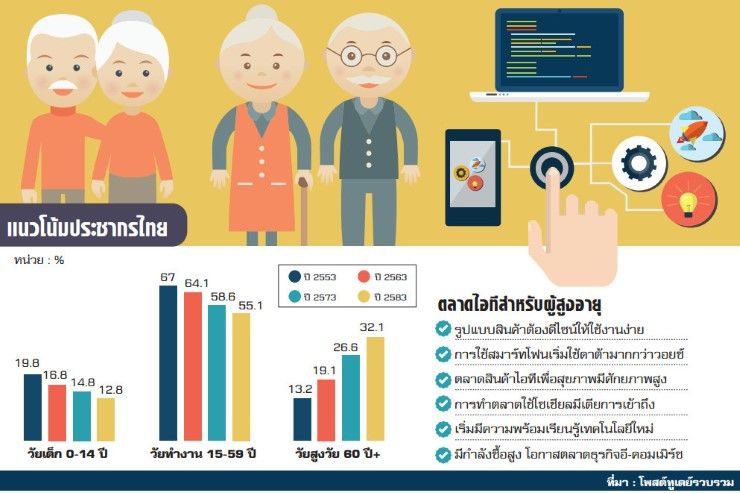 อีก 3 ปีข้างหน้า ไทยกำลังเข้าสู่สังคมผู้สูงอายุสูงสุด ที่มีประชากรอายุมากกว่า 60 ปีขึ้นไปต่อจำนวนประชากรทั้งหมดเกือบ 20% ทิศทางตลาดไอทีกับกลุ่มผู้สูงวัย จึงเป็นตลาดที่ไม่ควรมองข้าม ขณะนี้กลุ่มผู้สูงวัยไทยเริ่มมีพฤติกรรมการเล่นแชตผ่านทางไลน์ เริ่มใช้งานแอพพลิเคชั่นเช็กสุขภาพกันแล้ว