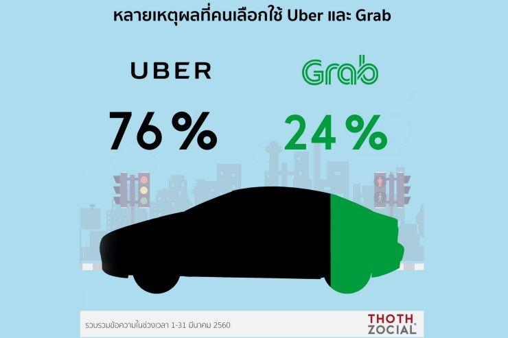 จึงไม่น่าแปลกใจนักที่ปัจจุบัน Uber และ Grab เป็นบริการการขนส่งที่ได้รับความนิยมอย่างมาก ทางทีมงานได้รวบรวมข้อมูลบนโซเชียลมีเดียที่พูดถึง Uber และ Grab ในเดือน มี.ค. พบว่ามีการพูดถึง Uber 76% และ Grab 24% สาเหตุหลักที่ทำให้การบริการของทั้งสองได้รับความนิยม คือ ความปลอดภัยราคา และความสะดวกสบาย
