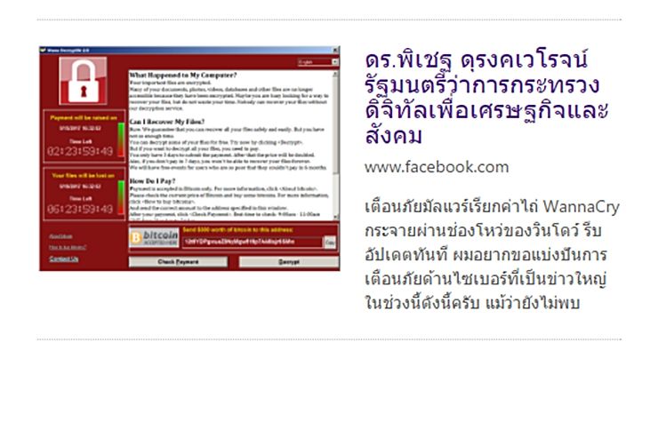 นายพิเชฐ ดุรงคเวโรจน์ รัฐมนตรีว่าการกระทรวงดิจิทัลเพื่อเศรษฐกิจและสังคม โพสต์ข้อความผ่านเฟซบุ๊ก เตือนภัยมัลแวร์เรียกค่าไถ่กระจายผ่านช่องโหว่ของวินโดว์ โดยแนะนำให้รีบอัปเดททันที พร้อมแนวทางการป้องกัน โดยมีรายละเอียดตามที่ปรากฎด้านล่างนี้
