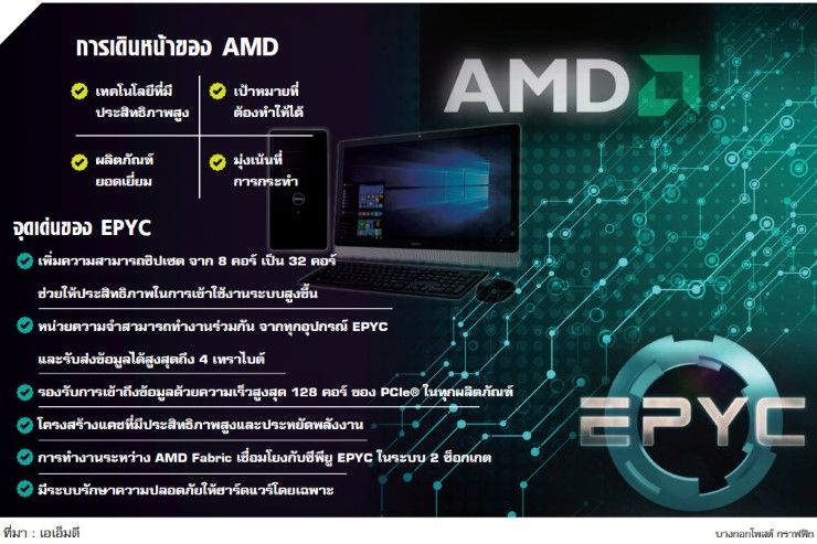 ทั้งนี้ เหตุผลที่จะทำให้เอเอ็มดีประสบความสำเร็จคือ มีกลยุทธ์ที่แตกต่างแข็งแกร่งด้านนวัตกรรมใหม่และมีโรดแมปแบบผู้นำ รวมทั้งโฟกัสในสิ่งที่แตกต่าง ผลิตภัณฑ์ EPYC ถือว่าเป็นโลกแห่งความจริงใบใหม่ในตลาดที่จะสร้างความน่าสนใจ นอกจากดีไซน์ที่แตกต่างแอพพลิเคชั่นที่น่าสนใจ คุณยังได้รับประสบการณ์ที่ไม่เหมือนใคร