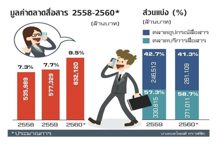 ผลการสำรวจตลาดสื่อสารของไทย ปี 2560 คาดว่าจะมีมูลค่าประมาณ 6.32 แสนล้านบาท ขยายตัว 9.5% จากปี 2559 ถือเป็นอัตราการเติบโตสูงสุดรอบ 5 ปี
