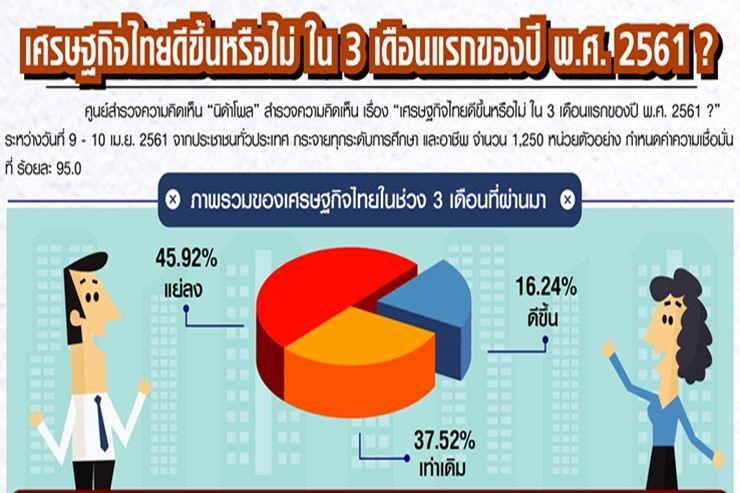เมื่อวันทที่ 22 เม.ย. ศูนย์สำรวจความคิดเห็น “นิด้าโพล” สถาบันบัณฑิตพัฒนบริหารศาสตร์ (นิด้า) เปิดเผยผลสำรวจความคิดเห็นของประชาชน เรื่อง “เศรษฐกิจไทยดีขึ้นหรือไม่ ใน 3 เดือนแรกของปี พ.ศ. 2561 ? ” ทำการสำรวจระหว่างวันที่ 9 – 10 เมษายน 2561โดยสอบถามความคิดเห็นจากประชาชนทั่วประเทศ กระจายทุกภูมิภาค ระดับการศึกษา และอาชีพ รวมทั้งสิ้น จำนวน 1,250 หน่วยตัวอย่าง เกี่ยวกับเศรษฐกิจไทยในช่วง 3 เดือนแรกของปี พ.ศ. 2561