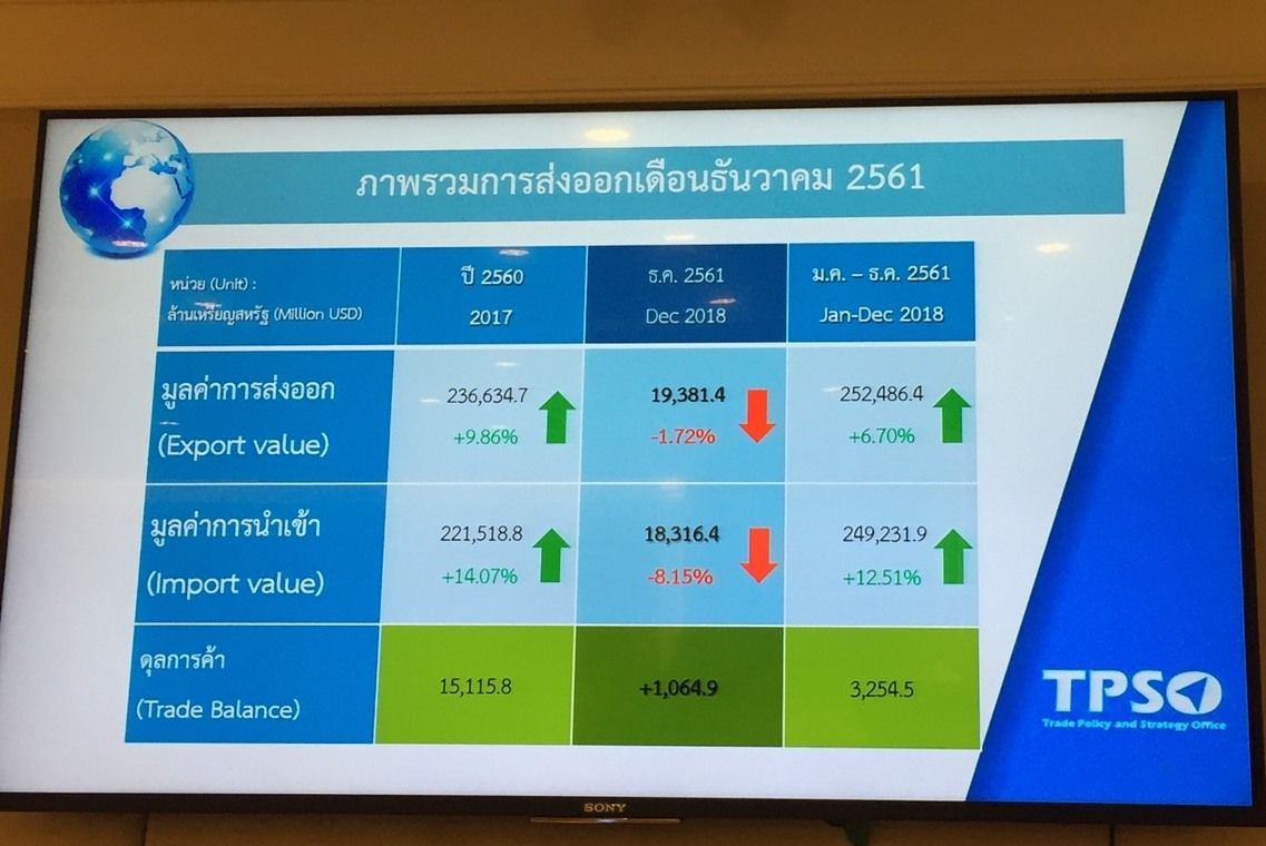 ทั้งนี้การส่งออกทั้งปี 2561 มูลค่า 252,486 ล้านดอลลาร์สหรัฐ เพิ่ม 6.70% ต่ำกว่าเป้าหมายคาดการณ์ไว้เติบโต 8% ส่วนนำเข้า 249,231.8 ล้านดอลลาร์สหรัฐ เพิ่ม 12.51% ไทยได้ดุลการค้าทั้งปี 2561 มูลค่า 3,254.5 ล้านดอลลาร์สหรัฐ ซึ่งการส่งออกติดลบมาจากผลของความขัดแย้งของสงครามการค้า ทำให้สินค้ากลุ่มอิเล็กทรอนิกส์และแผงวงจรไฟฟ้าติดลบ และทองคำติดลบ