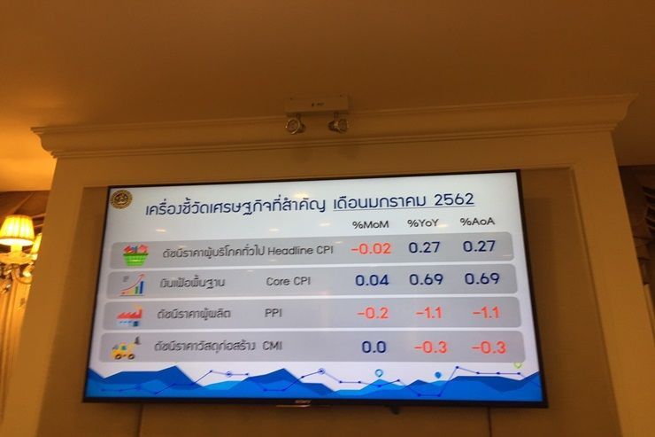 น.ส.พิมพ์ชนก วอนขอพร ผู้อำนวยการสำนักงานนโยบายและยุทธศาสตร์การค้า กระทรวงพาณิชย์ แถลงตัวเลขเงินเฟ้อเดือนม.ค. 2562 เท่ากับ 101.71 สูงขึ้น 0.27% เทียบกับม.ค.2561 และลดลง 0.02% เทียบกับธ.ค.2561