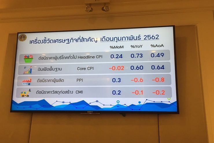 น.ส.พิมพ์ชนก วอนขอพร ผู้อำนวยการสำนักงานนโยบายและยุทธศาสตร์การค้า กระทรวงพาณิชย์ แถลงตัวเลขเงินเฟ้อเดือนก.พ. 2562 เท่ากับ 101.95 สูงขึ้น 0.73% เทียบกับก.พ.2561 และสูงขึ้น 0.24% เทียบกับม.ค. 2562