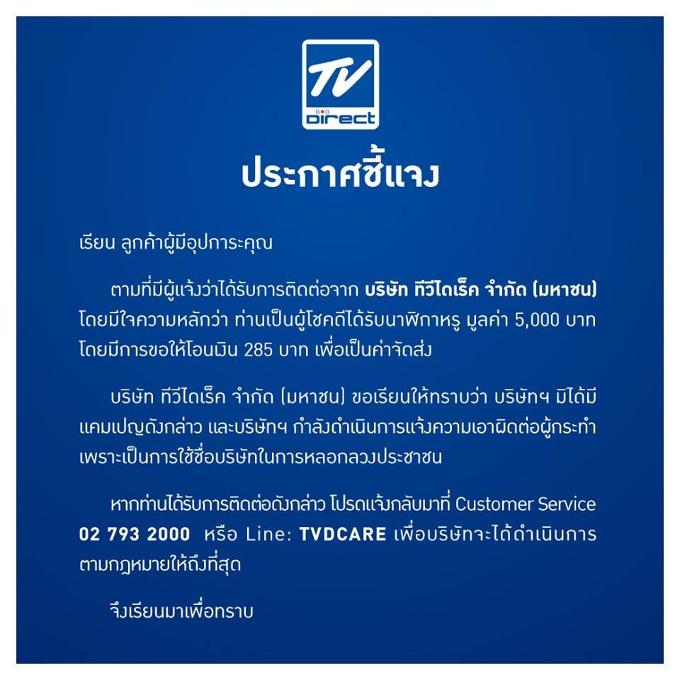 บริษัท ทีวีไดเร็ค แจ้งว่า ตามที่มีผู้แจ้งว่าได้รับการติดต่อจากทางบริษัทโดยมีใจความว่า ท่านเป็นผู้โชคดีได้รับนาฬิกาหรู มูลค่า 5,000 บาท โดยมีการขอให้โอนเงิน 285 บาท เพื่อเป็นค่าจัดส่ง บริษัทขอเรียนให้ทราบว่ามิได้มีแคมเปญดังกล่าว และบริษัทฯ กำลังดำเนินการแจ้งความเอาผิดต่อผู้กระทำ เพราะเป็นการใช้ชื่อบริษัทในการหลอกลวงประชาชน