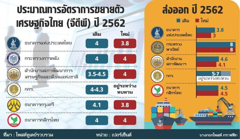 นายทิตนันทิ์ มัลลิกะมาส เลขานุการคณะกรรมการนโยบายการเงิน (กนง.) เปิดเผยว่า กนง.ได้มีมติปรับลดตัวเลขประมาณการขยายตัวของเศรษฐกิจ(จีดีพี) ปี 2562 ลงจาก 4.1% เหลือ 3.8% และเศรษฐกิจปี 2563 คาดว่าจะขยายตัว 3.9% โดยการปรับลดคาดการณ์เศรษฐกิจลงเป็นผลมาจากการส่งออกที่ชะลอตัวลง โดยคาดว่าจะขยายตัวที่ 3% จากเดิม 3.8% อันเป็นผลกระทบจากมาตรการกีดกันทางการค้าระหว่างจีนและสหรัฐ ทำให้เศรษฐกิจโลกขยายตัวลดลง อย่างไรก็ดี กนง.ยังเห็นว่าเศรษฐกิจไทยขยายตัวใกล้เคียงศักยภาพ