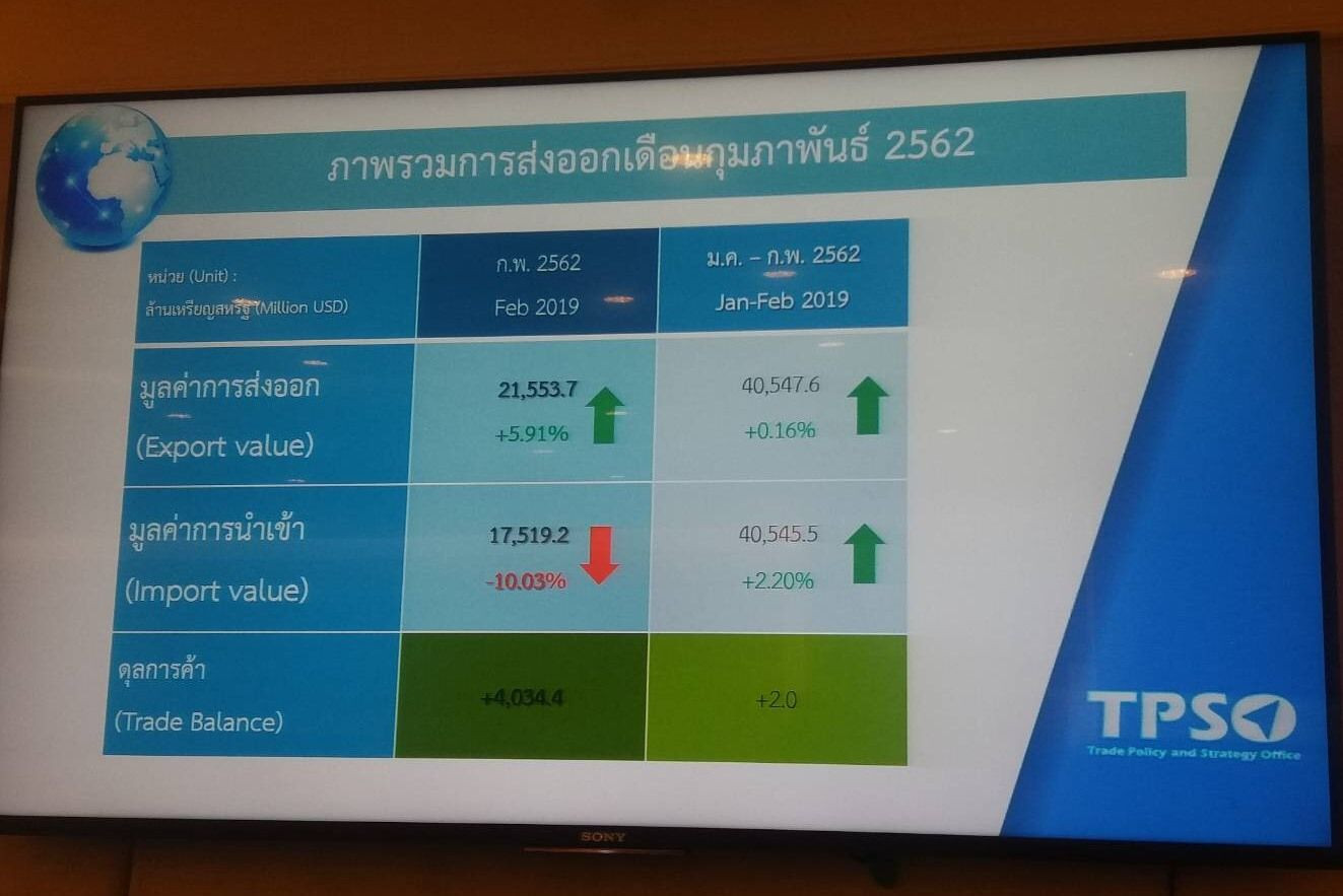 นางสาวพิมพ์ชนก วอนขอพร ผู้อำนวยการสำนักงานนโยบายและยุทธศาสตร์การค้า (สนค.) กระทรวงพาณิชย์ กล่าวว่า การส่งออกสินค้าไทยเดือนก.พ. 2562 มีมูลค่า 21,553.7 ล้านดอลลาร์สหรัฐ เพิ่มขึ้น 5.91% พลิกกลับมาเป็นบวกหลังจากส่งออกม.ค.ติดลบ ส่วนการนำเข้ามีมูลค่า 17,519.2 ลดลง 10.03% ส่งผลให้ไทยเกินดุลการค้า ก.พ. 4,034.4 ล้านดอลลาร์