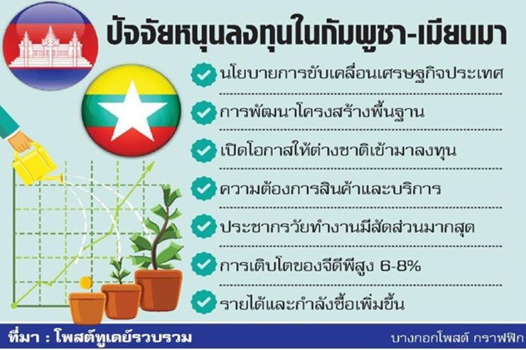 ปฏิเสธไม่ได้ว่ากลุ่มประเทศซีแอลเอ็มวี (CLMV) โดยเฉพาะประเทศกัมพูชาและเมียนมา ปัจจุบันเป็นที่สนใจของนักลงทุนจากนานาประเทศ ซึ่งถือว่าเป็นตลาดเกิดใหม่ในภูมิภาคที่น่าจับตามองจากนโยบายการขับเคลื่อนเศรษฐกิจที่พร้อมเปิดกว้างให้มีการลงทุนในประเทศมากขึ้น และนั่นคือโอกาสทางธุรกิจของผู้ประกอบการไทยเช่นกัน