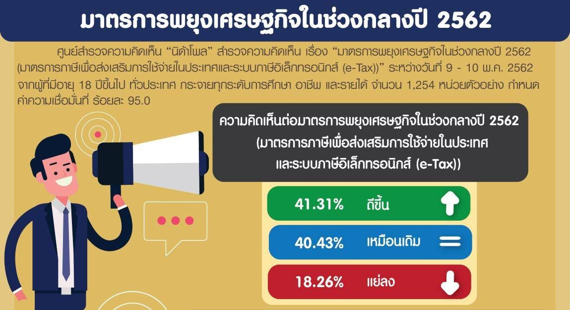 ศูนย์สำรวจความคิดเห็น “นิด้าโพล” สถาบันบัณฑิตพัฒนบริหารศาสตร์ (นิด้า) เปิดเผยผลสำรวจความคิดเห็นของประชาชนที่มีอายุ 18 ปีขึ้นไป เรื่อง “มาตรการพยุงเศรษฐกิจในช่วงกลางปี 2562” ทำการสำรวจระหว่างวันที่ 9 – 10 พฤษภาคม 2562 กระจายทุกภูมิภาค ระดับการศึกษา และอาชีพ รวมทั้งสิ้น จำนวน 1,254 หน่วยตัวอย่าง เกี่ยวกับมาตรการพยุงเศรษฐกิจในช่วงกลางปี 2562 (มาตรการภาษีเพื่อส่งเสริมการใช้จ่ายในประเทศ และระบบภาษีอิเล็กทรอนิกส์ (e-Tax) ซึ่งมี 6 มาตรการ ได้แก่ 1) มาตรการภาษีเพื่อกระตุ้นการซื้อสินค้า 2) มาตรการภาษีเพื่อส่งเสริมการอ่าน 3) มาตรการภาษีเพื่อส่งเสริมสินค้าท้องถิ่นไทย 4) มาตรการภาษีเพื่อส่งเสริมการท่องเที่ยวทั่วประเทศไทย 5) มาตรการภาษีเพื่อส่งเสริมการมีที่อยู่อาศัยเป็นของตนเอง และ 6) มาตรการภาษีเพื่อส่งเสริมและสนับสนุน e-Tax)