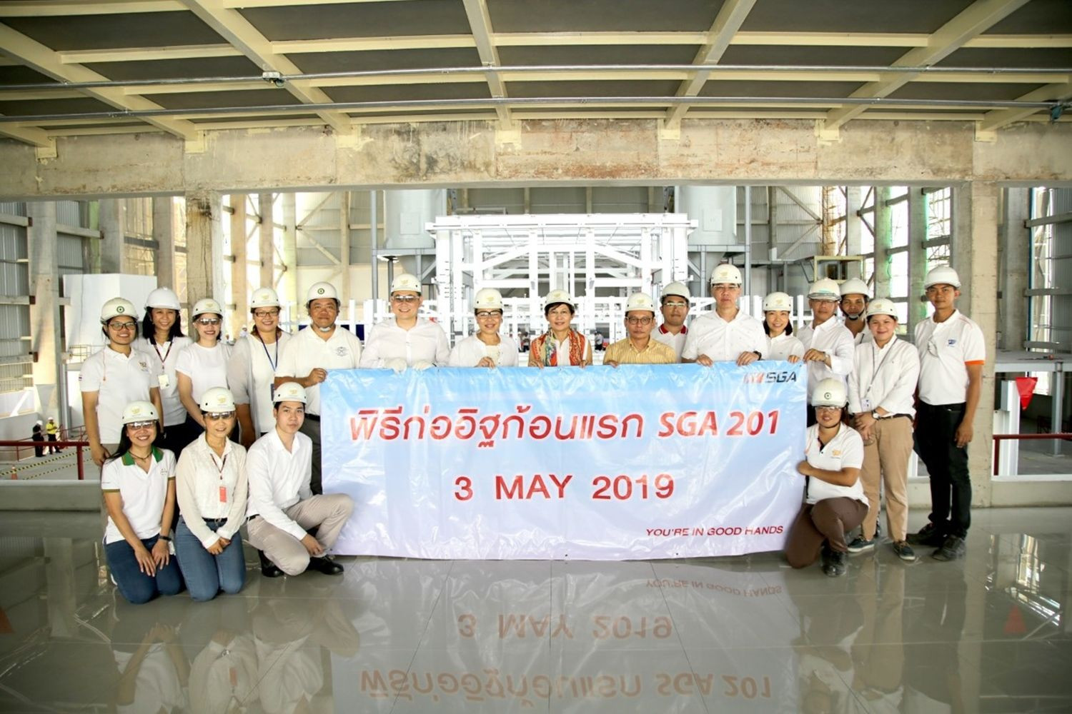 นายประธาน ไชยประสิทธิ์ (ที่ 9 จากซ้าย) รองประธานคณะกรรมการบริหาร และนางวรรณิภา ภักดีบุตร (กลาง) กรรมการผู้จัดการใหญ่ บริษัท โอสถสภา(OSP) ร่วมพิธีก่ออิฐก้อนแรกเพื่อเปิดโรงงานหลอมแก้วใหม่ที่นิคมอุตสาหกรรมโรจนะ จังหวัดพระนครศรีอยุธยา เพื่อใช้เป็นฐานการผลิตขวดแก้วในอนาคต โรงงานแห่งนี้ใช้เทคโนโลยีการผลิตที่ทันสมัยและสามารถบริหารจัดการต้นทุนได้ดี และมีกำลังผลิตสูง เป็นโรงงานผลิตขวดแก้วที่มีประสิทธิภาพสูงในระดับโลก