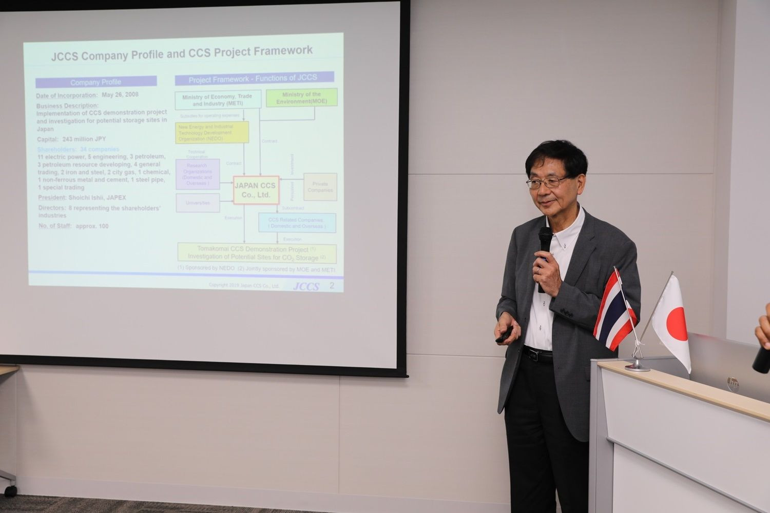 นอกจากนี้ ยังได้ศึกษาโครงการทดสอบเทคโนโลยีดักจับและกักเก็บก๊าซคาร์บอนไดออกไซด์หรือ CSS  ของ บริษัท เจแปน ซีซีเอส เมืองฮอกไกโด ซึ่งเป็นโครงการสาธิตที่ได้รับการสนับสนุนจากกระทรวงเศรษฐกิจการค้าและอุตสาหกรรมของประเทศญี่ปุ่น (METI)  เพื่อดำเนินการทดสอบในโรงกลั่นน้ำมัน ของบริษัท อิเดะมิสึ โคซัง ในเดือนเมษายนปี 2559   โดยมีกระบวนการทดสอบ 3 ขั้นตอน คือ การดักจับ การขนส่ง และ การฉีดอัดคาร์บอนไดออกไซด์ลงไปเก็บไว้ชั้นใต้ดิน ซึ่งเป็นชั้นหินที่กักเก็บน้ำมัน และก๊าซธรรมชาติที่หมดศักยภาพไปแล้ว ซึ่งจากการทดสอบสามารถนำไปใช้กับอุตสาหกรรมสำรวจและผลิตปิโตรเลียม โรงแยกก๊าซ โรงกลั่นน้ำมัน และโรงไฟฟ้าได้เป็นอย่างดี