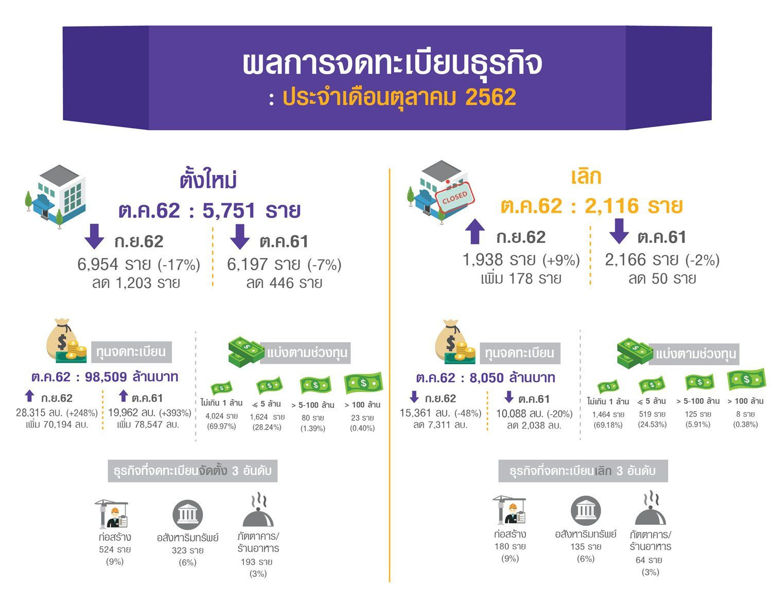 นางโสรดา เลิศอาภาจิตร์ รองอธิบดีกรมพัฒนาธุรกิจการค้า เปิดเผยถึง สถิติการจดทะเบียนธุรกิจ ประจำเดือนต.ค. 2562 พบว่า มีผู้ประกอบธุรกิจยื่นขอจดทะเบียนจัดตั้งห้างหุ้นส่วนบริษัทใหม่ทั่วประเทศ จำนวน 5,751 ราย เทียบกับเดือนกันยายน 2562 จำนวน 6,954 ราย ลดลงจำนวน 1,203 ราย คิดเป็นร้อยละ 17 และเมื่อเทียบกับเดือนตุลาคม 2561 จำนวน 6,197 ราย ลดลงจำนวน 446 ราย คิดเป็นร้อยละ 7