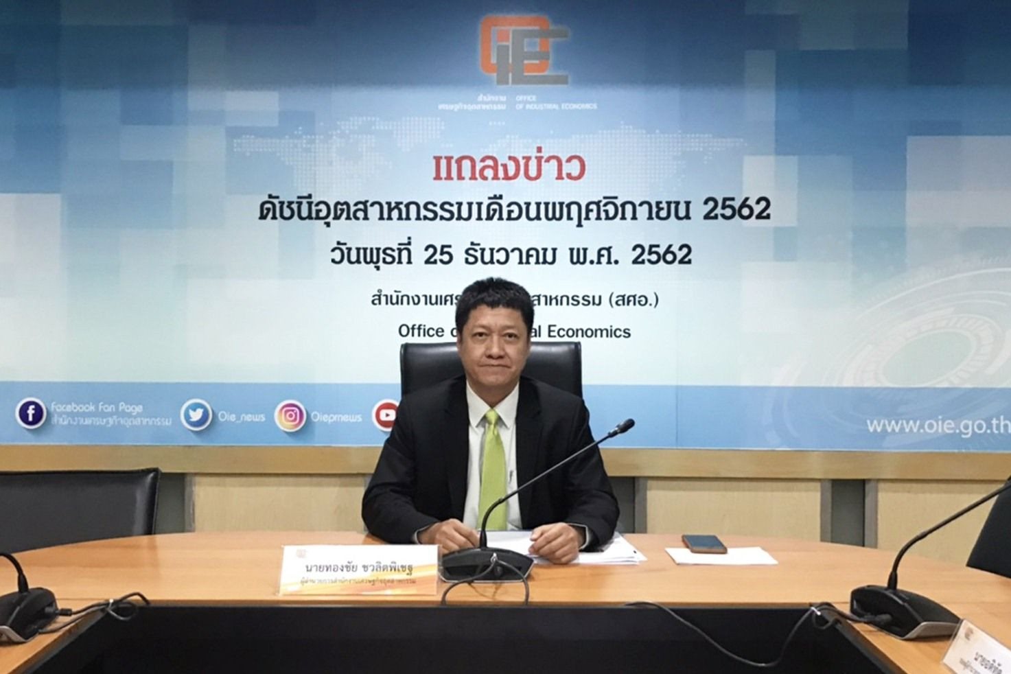 นายทองชัย ชวลิตพิเชฐ ผู้อำนวยการสำนักงานเศรษฐกิจอุตสาหกรรม (สศอ.) เปิดเผยว่า ดัชนีผลผลิตอุตสาหกรรม (MPI) เดือนพ.ย. 2562 หดตัวลง เมื่อเทียบจากช่วงเดียวกันของปีก่อน 8.27% อยู่ที่ระดับ 96.77 โดยอยู่ในระดับทรงตัวจากเดือนก่อนหน้า สาเหตุหลักมาจากผลกระทบจากสงครามทางการค้าทำให้เศรษฐกิจโลกชะลอตัวลง เมื่อดูจากตัวเลขผลิตภัณฑ์มวลรวมในประเทศ (จีดีพี) ของประเทศคู่ค้าสำคัญของไทยในไตรมาสที่ 3 ของปี 2562 ชะลอตัวลงอย่างต่อเนื่องตั้งแต่ต้นปี 2562 อาทิ สหรัฐอเมริกา สหภาพยุโรป และจีน ส่งผลต่อเนื่องมายังการส่งออกสินค้าอุตสาหกรรม (ไม่รวมทองคำ) ในเดือนพฤศจิกายน หดตัวลงร้อยละ 6.37