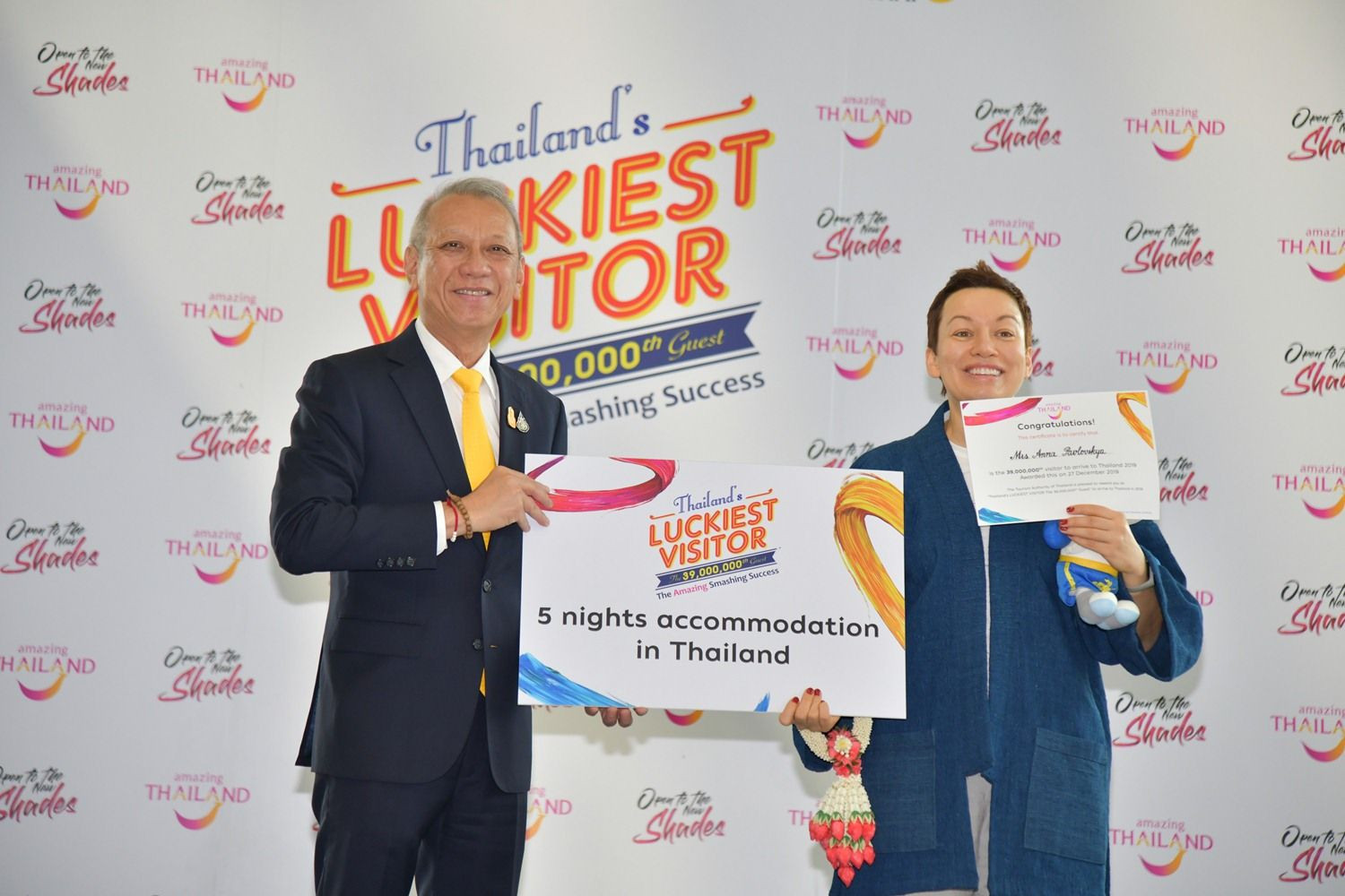 สำหรับนักท่องเที่ยวคนที่ 39 ล้าน คือ นางอันนา ปาฟโลฟสกายา ชาวรัสเซีย อายุ 45 ปี เดินทางจากกรุงมอสโก สหพันธรัฐรัสเซีย และเคยเดินทางมาประเทศไทยแล้ว 2 ครั้ง ส่วนในครั้งนี้เดินทางมาประเทศไทยด้วยสายการบินไทยเที่ยวบินที่ TG 975 มาพักผ่อนในช่วงปีใหม่ที่จังหวัดภูเก็ตพร้อมกับครอบครัว ทั้งนี้ นางอันนา จะได้รับเสื้อ Luckiest Visitor ประกาศนียบัตร แพ็คเกจที่พักโรงแรม 4-5 ดาวในประเทศไทย จำนวน 5 คืน จาก ททท. รางวัลบัตรโดยสารเครื่องบินไป-กลับ ชั้นประหยัด จำนวน 2 ที่นั่ง เส้นทางระหว่างประเทศที่ผู้ได้รับรางวัลมีถิ่นพำนักถาวรกลับมายังประเทศไทย จากบริษัท การบินไทย จำกัด (มหาชน) และบริการรถ AOT Limousine ส่งนักท่องเที่ยว เข้าที่พักในกรุงเทพฯ จากบริษัท ท่าอากาศยานไทย จำกัด (มหาชน)