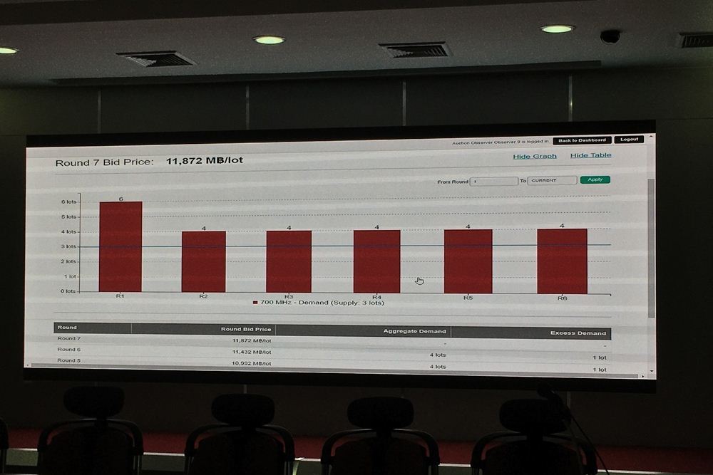 เริ่มการเคาะราคารอบแรกที่ 9,232 ล้านบาท ปรากฎว่ามีผู้เคาะแสดงความต้องการเข้ามา 6 ใบอนุญาต จากที่เปิดประมูล 3 ใบอนุญาต จากนั้นในรอบ 2 ที่ราคา 9,672 ล้านบาท ความต้องการลดเหลือ 4 ใบอนุญาต และยังคงแข่งขันราคาที่ 4 ใบอยุญาตจนถึงรอบที่ 19 ใบอนุญาต ราคาไล่ขึ้นมาถึงใบละ 17,152 ล้านบาท