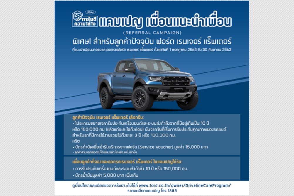 นอกจากนี้ ฟอร์ดยังมีอีกหนึ่งแคมเปญส่งเสริมการขายสุดพิเศษ เพื่อนแนะนำเพื่อน (Referral Campaign) สำหรับลูกค้าปัจจุบันที่ใช้รถ ฟอร์ด เรนเจอร์ แร็พเตอร์ โดยลูกค้าจะได้รับ SMS จากฟอร์ด เพื่อให้กดรับแสดงความสนใจ หรือติดต่อฟอร์ด คอลเซ็นเตอร์ หมายเลข 1383 เพื่อแจ้งความจำนงในการเข้าร่วมโปรแกรม สำหรับลูกค้าปัจจุบัน ฟอร์ด เรนเจอร์ แร็พเตอร์ ที่แนะนำให้เพื่อนมาจองและออกรถฟอร์ดเรนเจอร์ แร็พเตอร์ ในแคมเปญส่งเสริมการขาย Referral Campaign ตั้งแต่วันที่ 1 กรกฎาคม 2563 ถึง 30 กันยายน 2563 สามารถเลือกรับโปรแกรมขยายเวลารับประกันเครื่องยนต์และระบบส่งกำลังจากที่มีอยู่เดิม เป็น 10 ปี หรือ 150,000 กม. แล้วแต่ระยะใดถึงก่อน นับจากวันที่เริ่มการรับประกันคุณภาพของรถยนต์ หรือเลือกรับบัตรกำนัลเพื่อเข้ารับบริการจากฟอร์ด มูลค่า 15,000 บาท โดยสามารถเลือกรับได้เพียงอย่างใดอย่างหนึ่งเท่านั้น ส่วนเพื่อนลูกค้าที่ซื้อรถฟอร์ด เรนเจอร์ แร็พเตอร์ คันใหม่ ในแคมเปญนี้ จะได้รับบัตรน้ำมันมูลค่า 5,000 บาท เพิ่มเติม