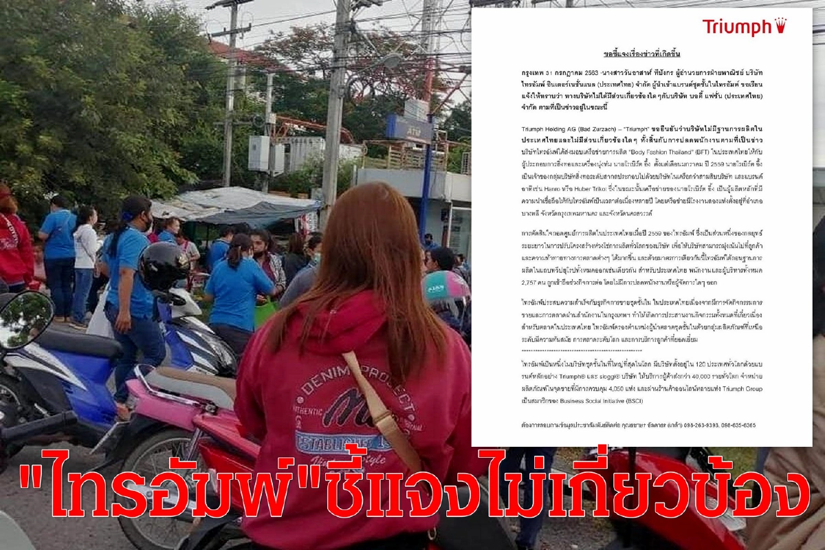 ไทรอัมพ์ ชี้แจงไม่เกี่ยวข้องกับโรงงาน บอดี้ แฟชั่น และการปลดพนักงานที่นครสวรรค์ ได้ถอดศูนย์การผลิตในไทยตั้งแต่เมื่อปี2559