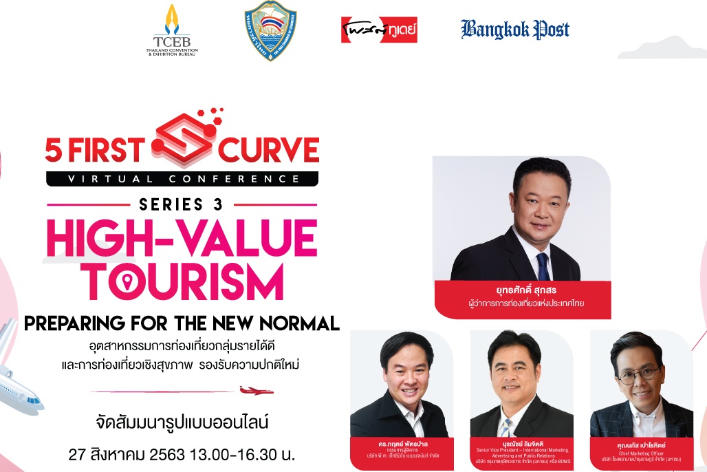 สสปน. ร่วมกับภาครัฐ-เอกชน เปิดข้อมูลอนาคตอุตสาหกรรมการท่องเที่ยวไ/ทย หลังโควิด-19 จะต้องไปทางไหน เป็นครั้งแรกในงานสัมมนาออนไลน์ 5 First S Curve อุตสาหกรรมการท่องเที่ยวกลุ่มรายได้ดี และการท่องเที่ยวเชิงสุขภาพ พร้อมไลฟ์สด 27 ส.ค.นี้