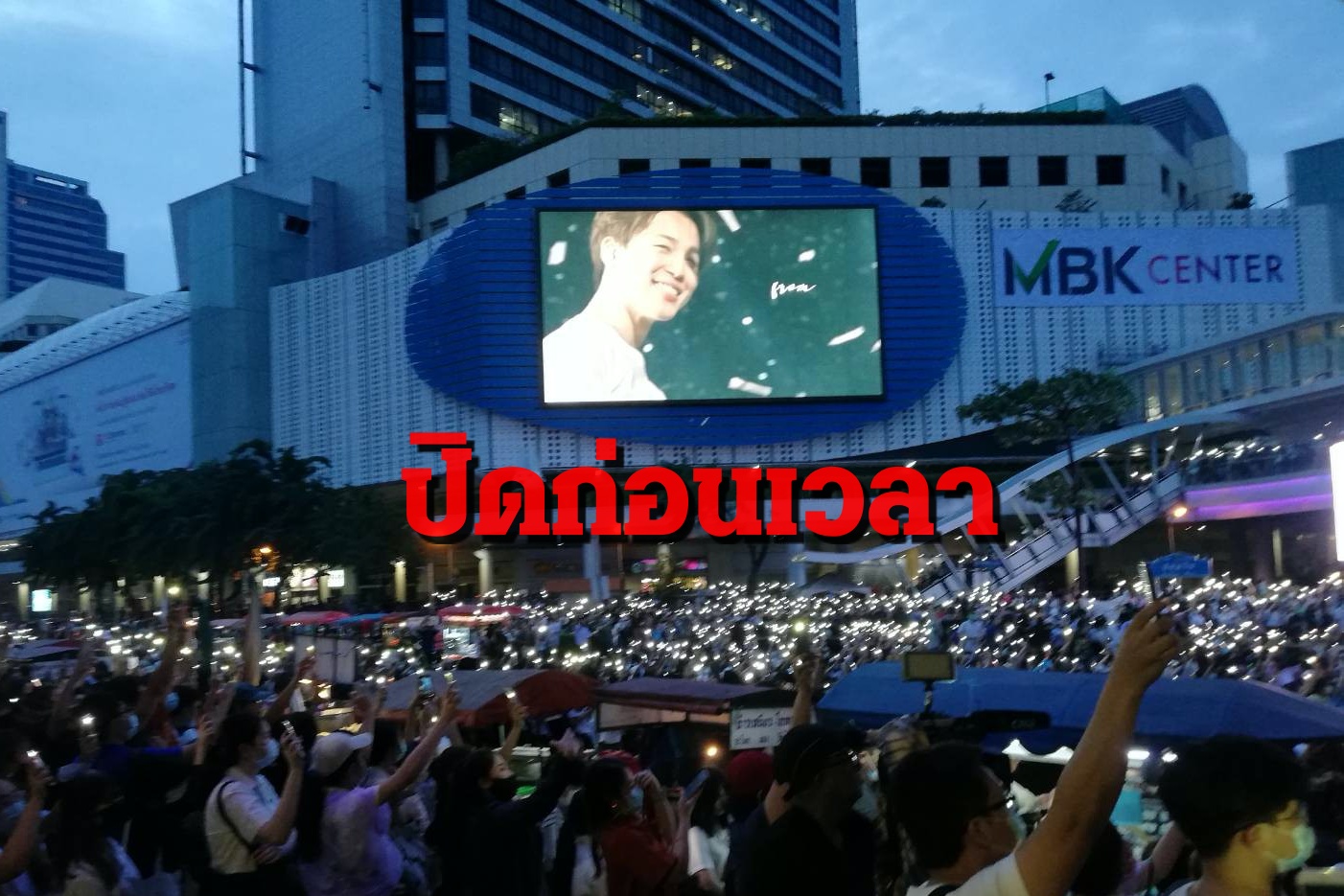 ล่าสุดศูนย์การค้าเอ็มบีเคเซ็นเตอร์ประกาศแจ้งปิดศูนย์การค้าเร็วขึ้นกว่าเวลาปกติในวันนี้ (16 ต.ค.2563) เป็นเวลา 17.00 น. เพื่อความสะดวกในการเดินทาง และคำนึงถึงความปลอดภัยของลูกค้าที่มาใช้บริการภายในศูนย์การค้าฯ และพนักงานทุกท่าน เนื่องจากมีการชุมนุมและปิดการจราจรบริเวณสี่แยกปทุมวัน จากในวันปกติปิดให้บริการ 22.00 น.