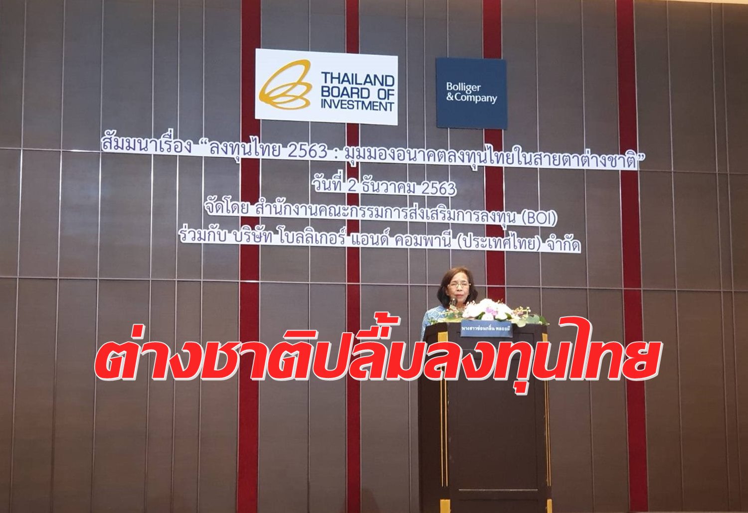 น.ส.ซ่อนกลิ่น พลอยมี    ที่ปรึกษาด้านการลงทุน สำนักงานคณะกรรมการส่งเสริมการลงทุน(บีโอไอ) เปิดเผยผลสำรวจความเชื่อมั่นของนักลงทุนต่างชาติในประเทศไทย ประจำปี 2563 ในงานสัมมนาเรื่อง “ลงทุนไทย 2563: มุมมองอนาคตไทยในสายตาต่างชาติ” โดยสำรวจจากกลุ่มตัวอย่าง จำนวน 600 บริษัท พบว่าผู้ตอบแบบสำรวจร้อยละ 96 มีแผนการลงทุนในไทยอย่างต่อเนื่อง โดยร้อยละ 76.67 ยังคงรักษาระดับการลงทุน ในขณะที่ร้อยละ 19.33 มีแผนจะขยายการลงทุนเพิ่มเติม แม้จะอยู่ในสถานการณ์การแพร่ระบาดของโควิด-19