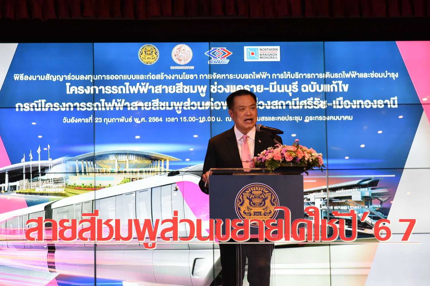 นายอนุทิน  ชาญวีรกูล  รองนายกรัฐมนตรี   เปิดเผยภายหลังเป็นประธานในพิธีลงนามสัญญาร่วมลงทุนการออกแบบและก่อสร้างงานโยธา การจัดหาระบบรถไฟฟ้า การให้บริการการเดินรถไฟฟ้าและซ่อมบำรุงรักษา โครงการรถไฟฟ้าสายสีชมพู ช่วงแคราย – มีนบุรี ฉบับแก้ไขส่วนต่อขยาย ช่วงสถานีศรีรัช – เมืองทองธานี ระหว่างการรถไฟฟ้าขนส่งมวลชนแห่งประเทศไทย (รฟม.)กับบริษัท นอร์ทเทิร์น บางกอกโมโนเรล จำกัด (NBM) ว่าโครงการรถไฟฟ้าสายสีชมพูฯ เป็นการพัฒนาโครงสร้างพื้นฐานของประเทศ อยู่ในแผนยุทธศาสตร์ชาติ ระยะ 20 ปี ซึ่งโครงการ มีความก้าวหน้าอย่างต่อเนื่อง และเพื่อยกระดับโครงข่ายเส้นทางให้มีศักยภาพเพิ่มมากขึ้น รัฐบาลจึงได้อนุมัติให้บรรจุโครงการรถไฟฟ้าสายสีชมพูส่วนต่อขยาย ช่วงสถานีศรีรัช – เมืองทองธานี ในแผนแม่บทระบบขนส่งมวลชนทางรางในเขตกรุงเทพมหานครและปริมณฑล