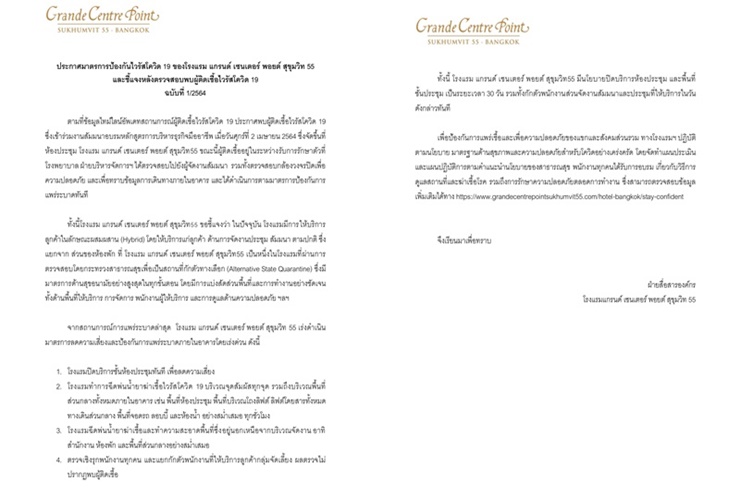 ทั้งนี้โรงแรม แกรนด์ เซนเตอร์ พอยต์ สุขุมวิท55 ขอชี้แจงว่า ในปัจจุบัน โรงแรมมีการให้บริการลูกค้าในลักษณะผสมผสาน (Hybrid) โดยให้บริการแก่ลูกค้า ด้านการจัดงานประชุม สัมมนา ตามปกติซึ่งแยกจาก ส่วนของห้องพัก ที่ โรงแรม แกรนด์ เซนเตอร์ พอยต์ สุขุมวิท55 เป็นหนึ่งในโรงแรมที่ผ่านการตรวจสอบโดยกระทรวงสาธารณสุขเพื่อเป็นสถานที่กักตัวทางเลือก (Alternative State Quarantine) ซึ่งมีมาตรการด้านสุขอนามัยอย่างสูงสุดในทุกขั้นตอน โดยมีการแบ่งสัดส่วนพื้นที่และการทำงานอย่างชัดเจน ทั้งด้านพื้นที่ให้บริการ การจัดการ พนักงานผู้ให้บริการและการดูแลด้านความปลอดภัย ฯลฯ