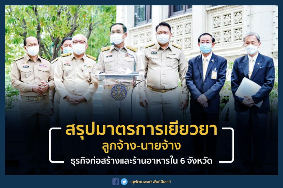 "ท่านนายกฯ และคณะที่ปรึกษาฯ แถลงมาตรการเยียวยานายจ้าง-ลูกจ้างที่ได้รับผลกระทบจากประกาศ ฉบับที่ 25 (ปิดแคมป์คนงาน ร้านอาหารงดนั่งในร้าน) ในช่วง 1 เดือน โดยครอบคลุมพื้นที่ 6 จังหวัด (กรุงเทพฯ, นนทบุรี, ปทุมธานี, สมุทรปราการ สมุทรสาคร, นครปฐม) ในกลุ่มก่อสร้าง, สถานบริการ, ร้านอาหารและเครื่องดื่ม, กลุ่มศิลปะ บันเทิงและสันทนาการ โดยใช้งบประมาณ 7,500 ล้านบาท เป็นเงินประกันสังคม 3,500 ล้านบาท และจากรัฐบาล 4,000 ล้านบาท ลูกจ้าง-นายจ้างหรือเจ้าของกิจการจะได้รับเงินชดเชยตามรายละเอียดดังนี้