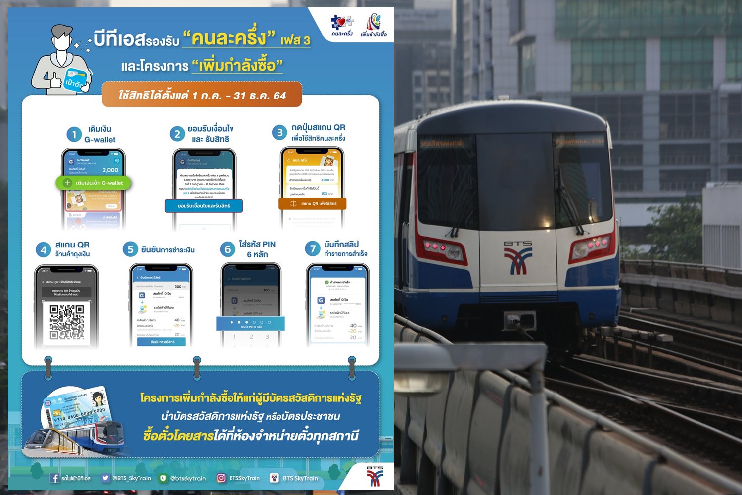 นายสุรพงษ์ เลาหะอัญญา กรรมการผู้อำนวยการใหญ่ บมจ. ระบบขนส่งมวลชนกรุงเทพ ผู้ให้บริการรถไฟฟ้าบีทีเอส แจ้งว่าในวันที่ 1 กรกฎาคม 2564 เป็นวันแรกซึ่งประชาชนที่ลงทะเบียนเข้าร่วม โครงการ "คนละครึ่ง" เฟส 3 และโครงการ "เพิ่มกำลังซื้อ" จะสามารถใช้เงินสนับสนุนจากทางภาครัฐบาลที่ต้องการช่วยเหลือ และแบ่งเบาภาระของประชาชนที่ได้รับผลกระทบจากวิกฤติเชื้อไวรัสโคโรนา 2019 (โควิด-19) และช่วยลดภาระค่าใช้จ่ายในการเดินทาง ลดการสัมผัสเงินสด และสร้างความปลอดภัย มั่นใจในการเดินทางให้กับประชาชน