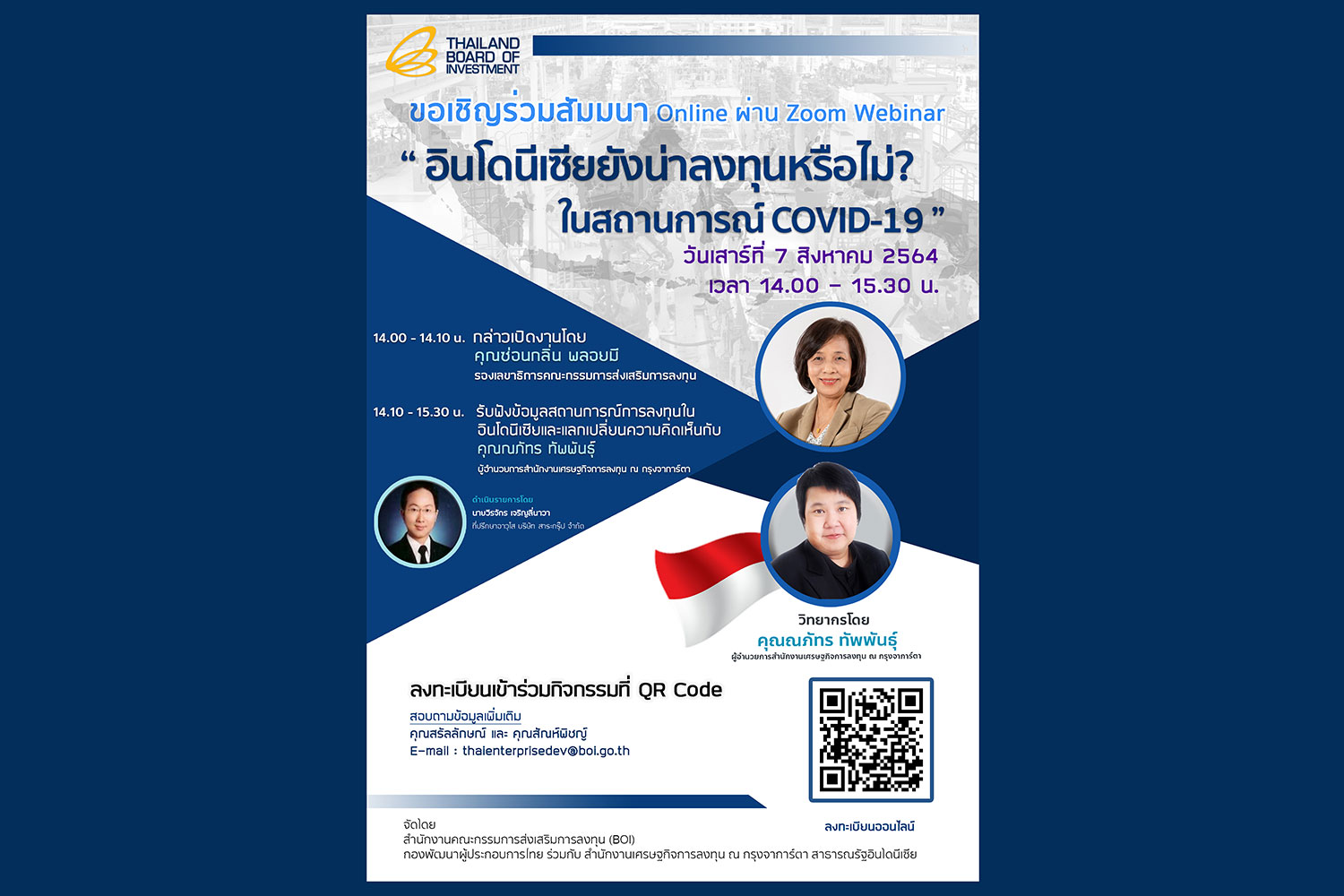 บีโอไอเชิญร่วมสัมมนาออนไลน์ “อินโดนีเซียยังน่าลงทุนหรือไม่? ในสถานการณ์ COVID-19”