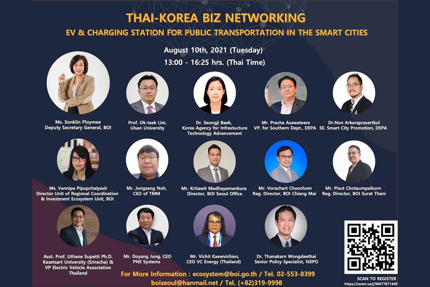สำนักงานคณะกรรมการส่งเสริมการลงทุน หรือ บีโอไอ โดยกองประสานและพัฒนาปัจจัยการลงทุน และบีโอไอศูนย์ภูมิภาคทั้ง 7 แห่ง ร่วมกับ บีโอไอ โซล ขอเชิญร่วมงาน Webinar เพื่อสร้างเครือข่ายธุรกิจในหัวข้อ “THAI-KOREA BIZ NETWORKING: EV & Charging Station for Public Transportation in the Smart Cities”
