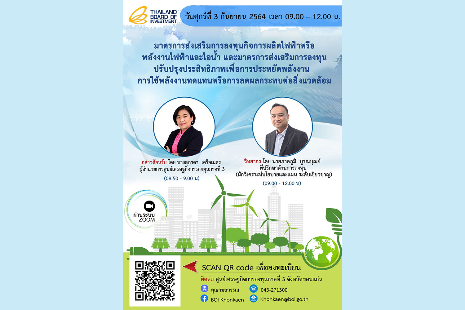 บีโอไอ ขอนแก่น ขอเชิญเข้าร่วมสัมมนาออนไลน์ (ZOOM Webinar) หัวข้อ "มาตรการส่งเสริมการลงทุนกิจการผลิตไฟฟ้าหรือพลังงานไฟฟ้าและไอน้ำ และมาตรการส่งเสริมการลงทุนปรับปรุงประสิทธิภาพเพื่อการประหยัดพลังงาน การใช้พลังงานทดแทน หรือการลดผลกระทบต่อสิ่งแวดล้อม"