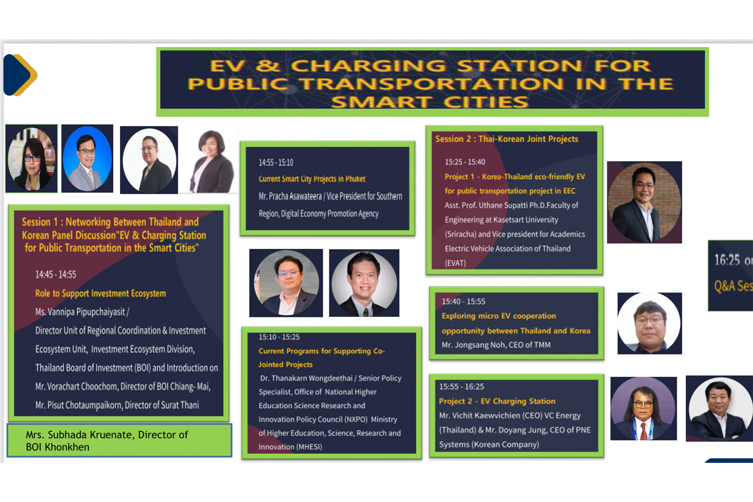 โดยมีวิทยากรทั้งจากภาครัฐและเอกชน ได้แก่ สำนักงานส่งเสริมเศรษฐกิจดิจิทัล (DEPA) ส่วนกลางและภูเก็ต (โครงการล่าสุดในภูเก็ต Sandbox) สำนักงานสภานโยบายการอุดมศึกษา วิทยาศาสตร์ วิจัยและนวัตกรรมแห่งชาติ (สอวช.) Korea Agency for Infrastructure Technology Advancement มหาวิทยาลัย ULSAN สมาคมยานยนต์ไฟฟ้าไทย (EVAT) มหาวิทยาลัยเกษตรศาสตร์ วิทยาเขตศรีราชา และผู้บริหารจากบริษัทเอกชนชั้นนำไทยและเกาหลีใต้ นำเสนอและแสดงความประสงค์ในการสร้างเครือข่าย ร่วมแลกเปลี่ยนทั้งมาตรการส่งเสริมการลงทุน เปิดโอกาสสร้างเครือข่ายธุรกิจในกลุ่ม EV & Charging Station กลุ่มพัฒนาเมือง และ Smart Cities ตลอดจนอัพเดตโครงการที่น่าสนใจ ความร่วมมือ การสนับสนุนจากภาครัฐและเอกชน มหาวิทยาลัยของไทยและเกาหลีใต้ รวมทั้งบูรณาการความร่วมมือเพื่อขับเคลื่อนระบบนิเวศนวัตกรรมด้าน EV & Charging Station และ Smart Cities