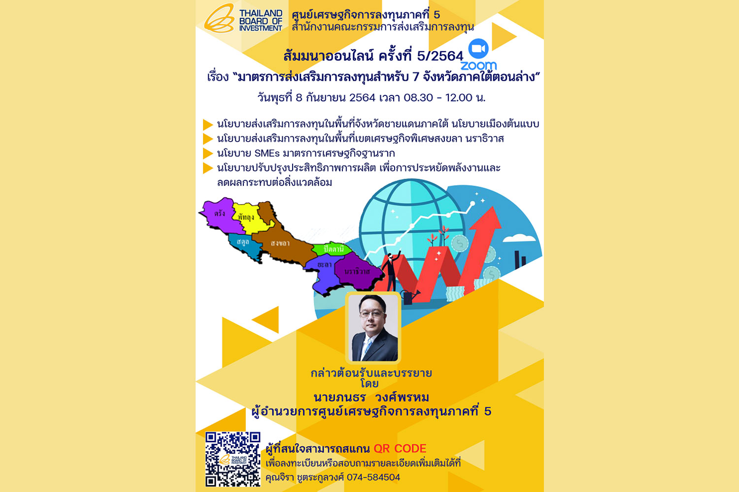 ศูนย์เศรษฐกิจการลงทุนภาคที่ 5 หรือ บีโอไอ สงขลา ขอเชิญร่วมสัมมนาออนไลน์ เรื่อง "มาตรการส่งเสริมการลงทุนสำหรับ 7 จังหวัดภาคใต้ตอนล่าง"